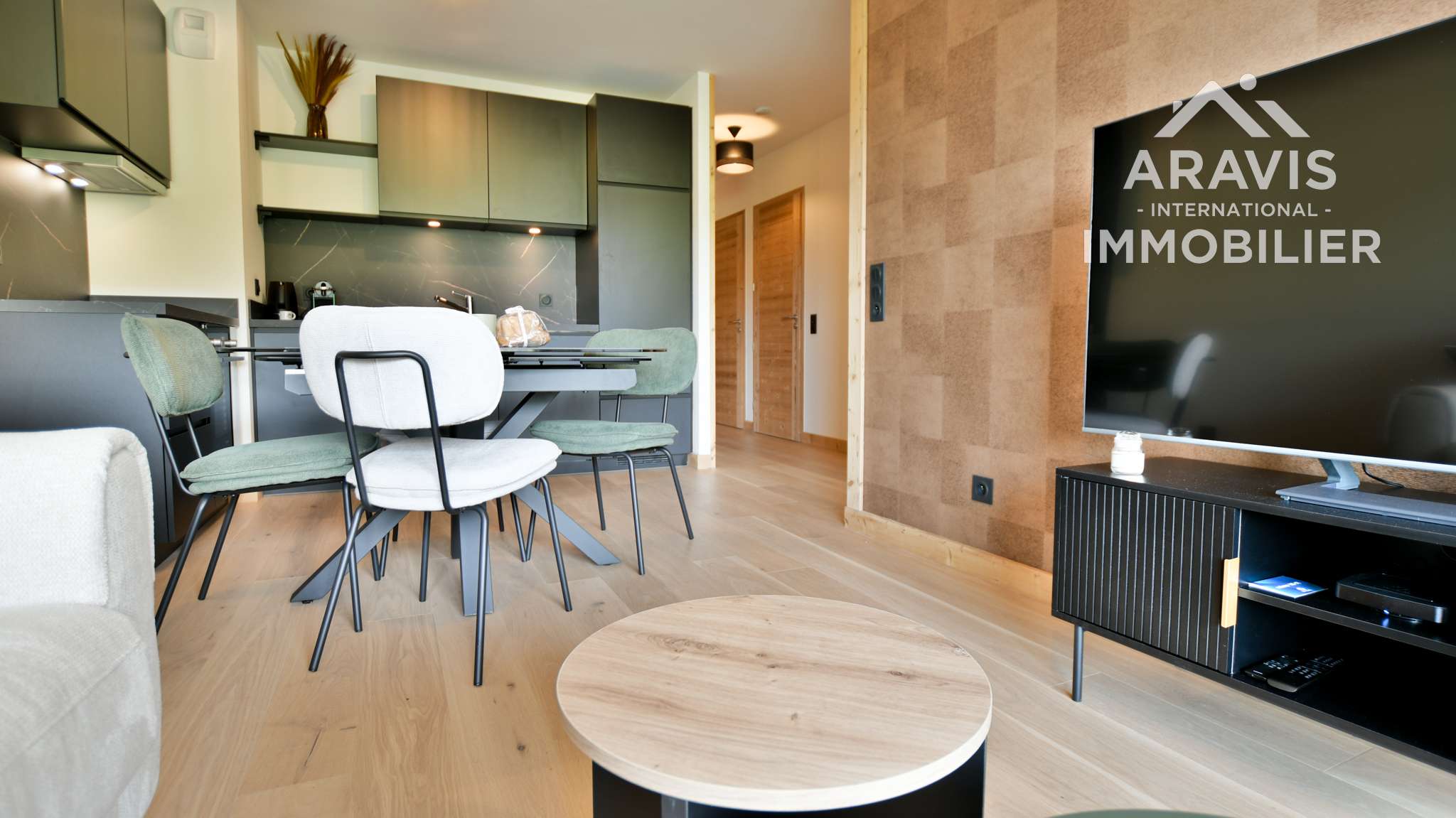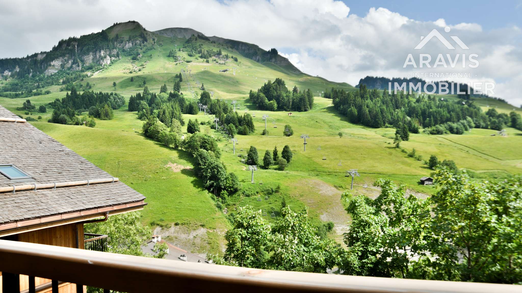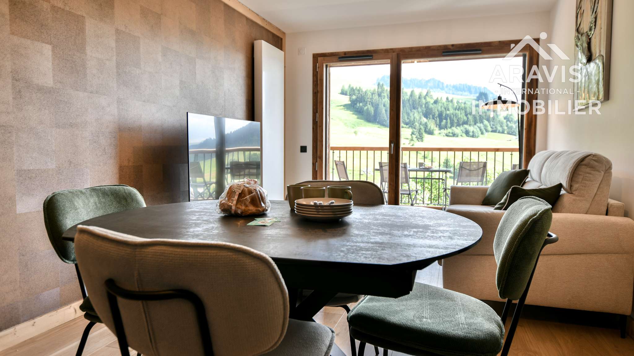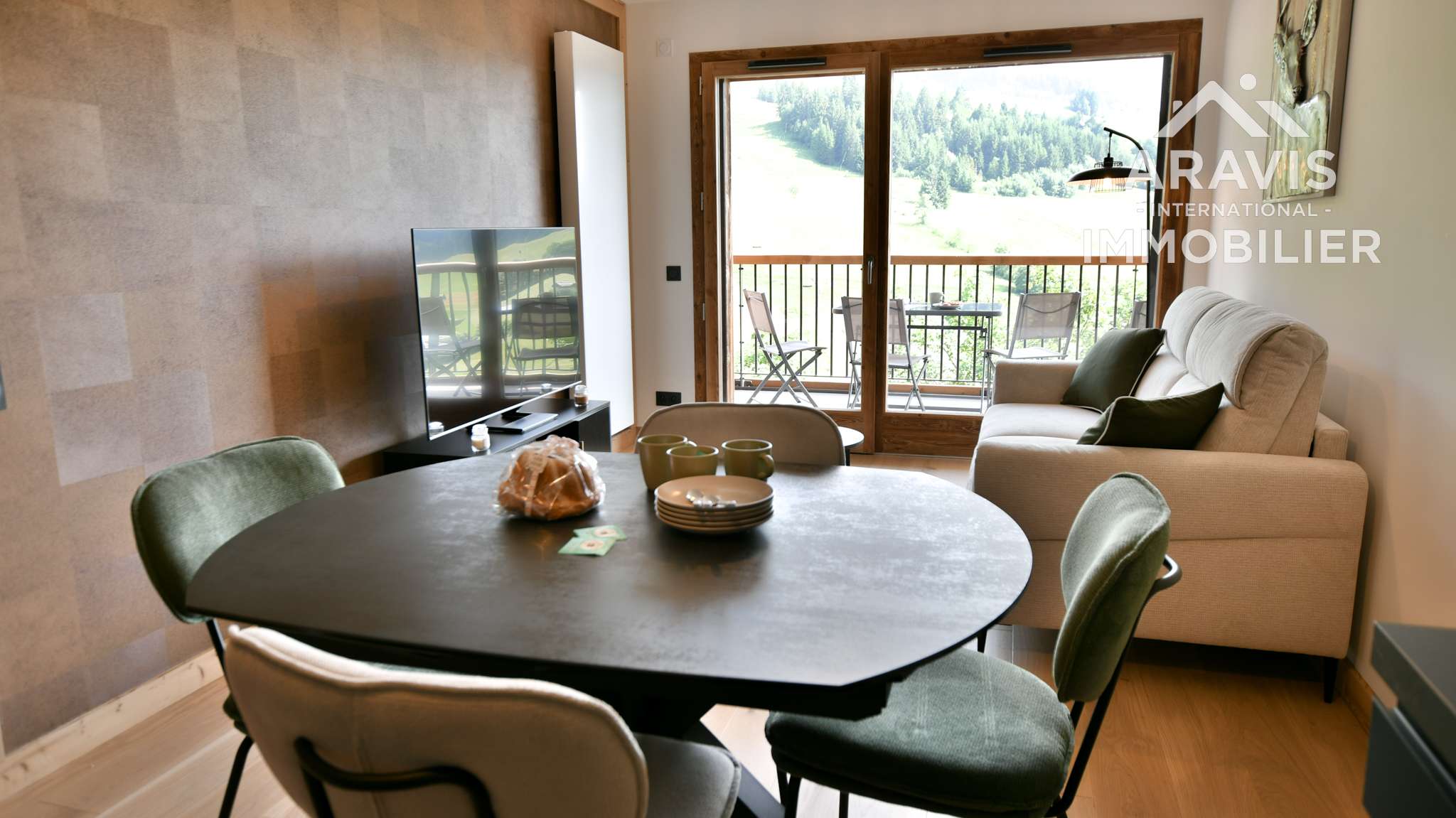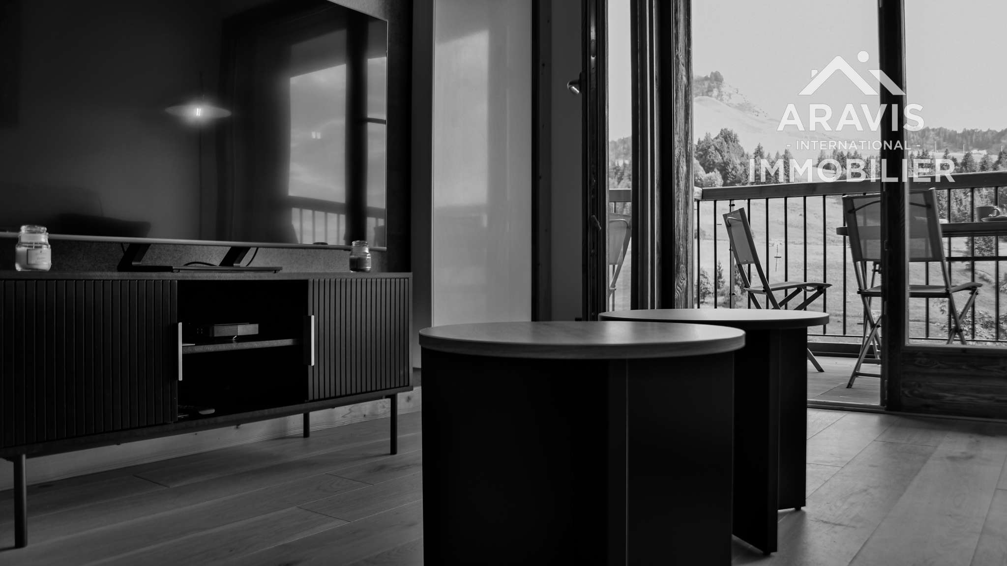 Appartement tout confort pour 2 adultes + 2 enfants, avec balcon panoramique, cuisine équipée, casier à ski et navette aux pieds de la résidence.