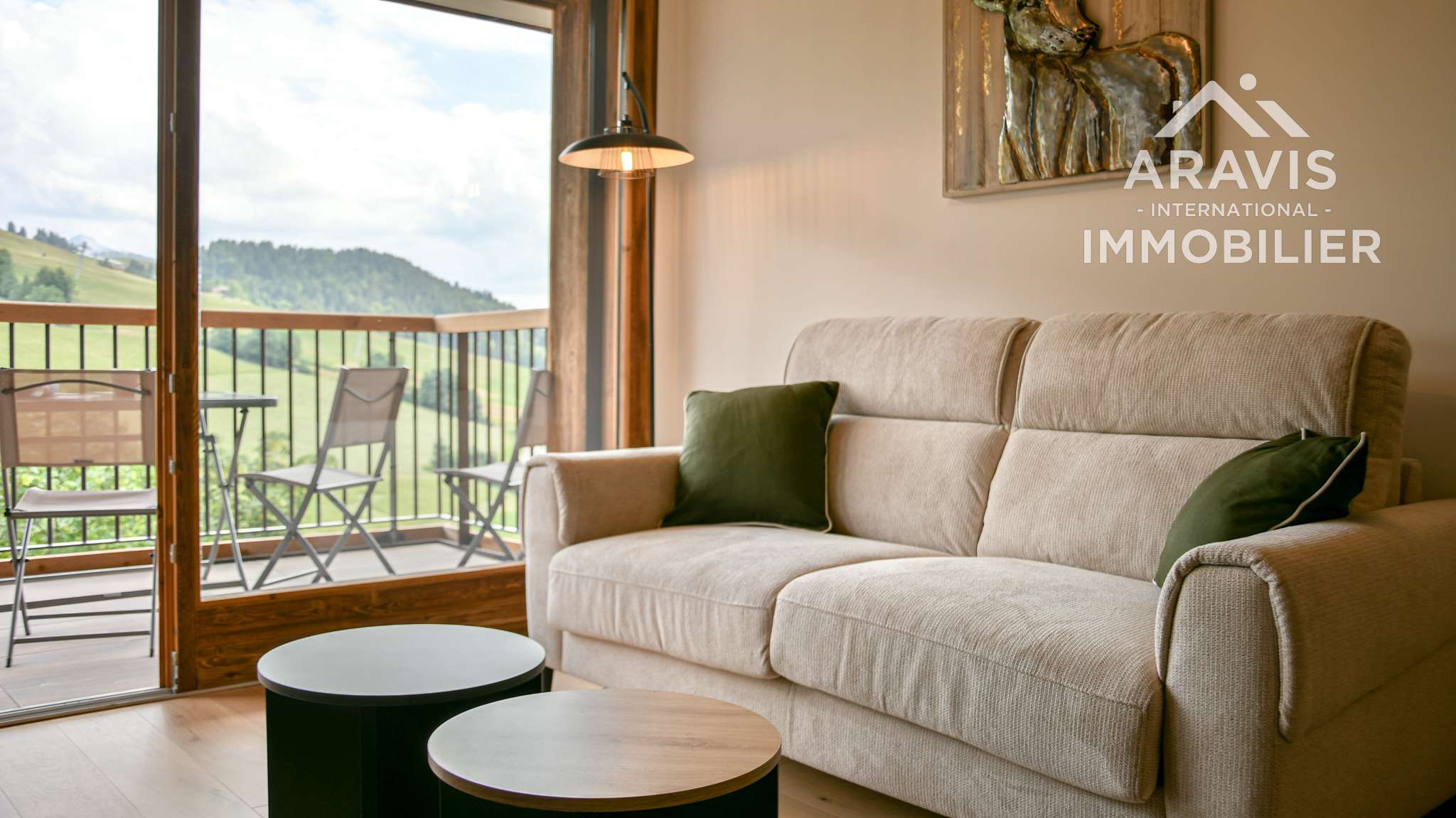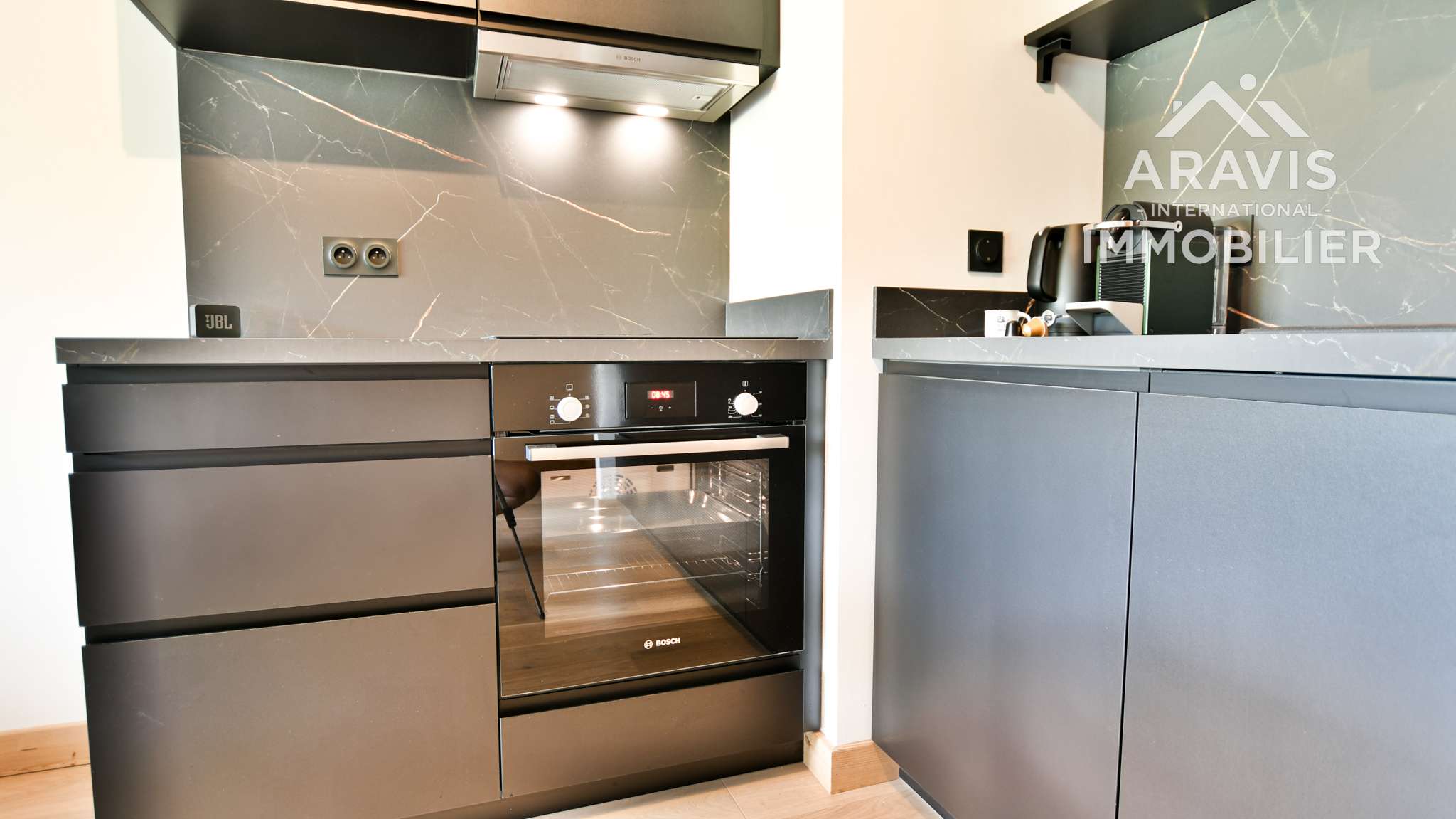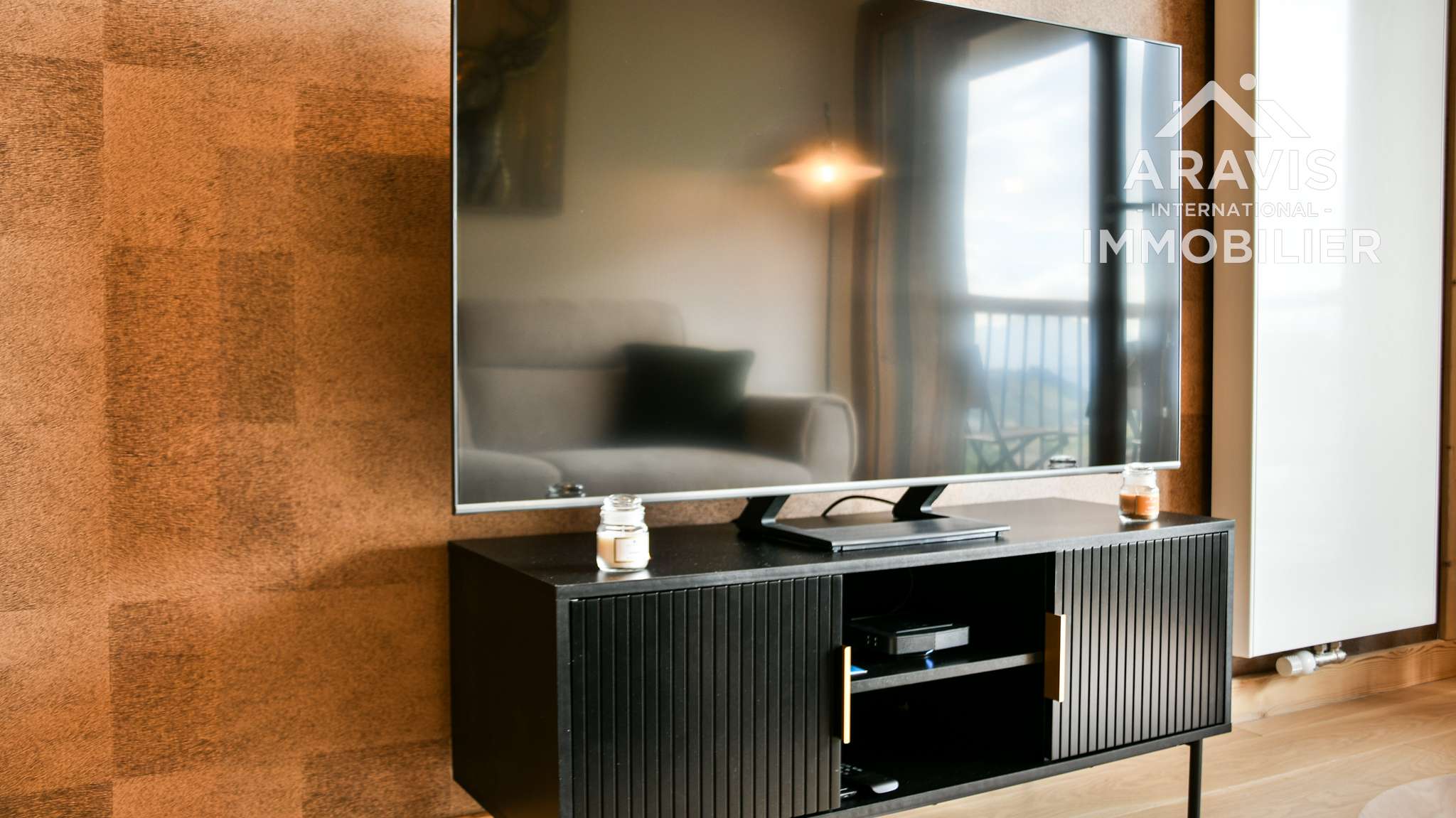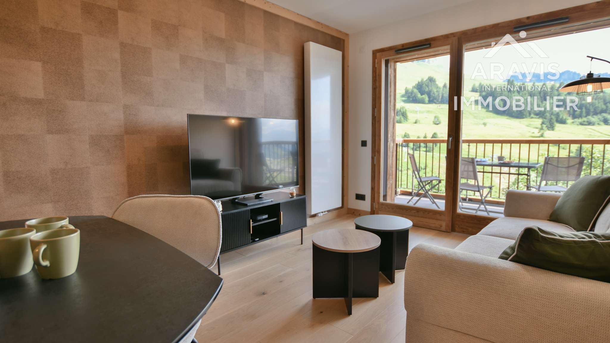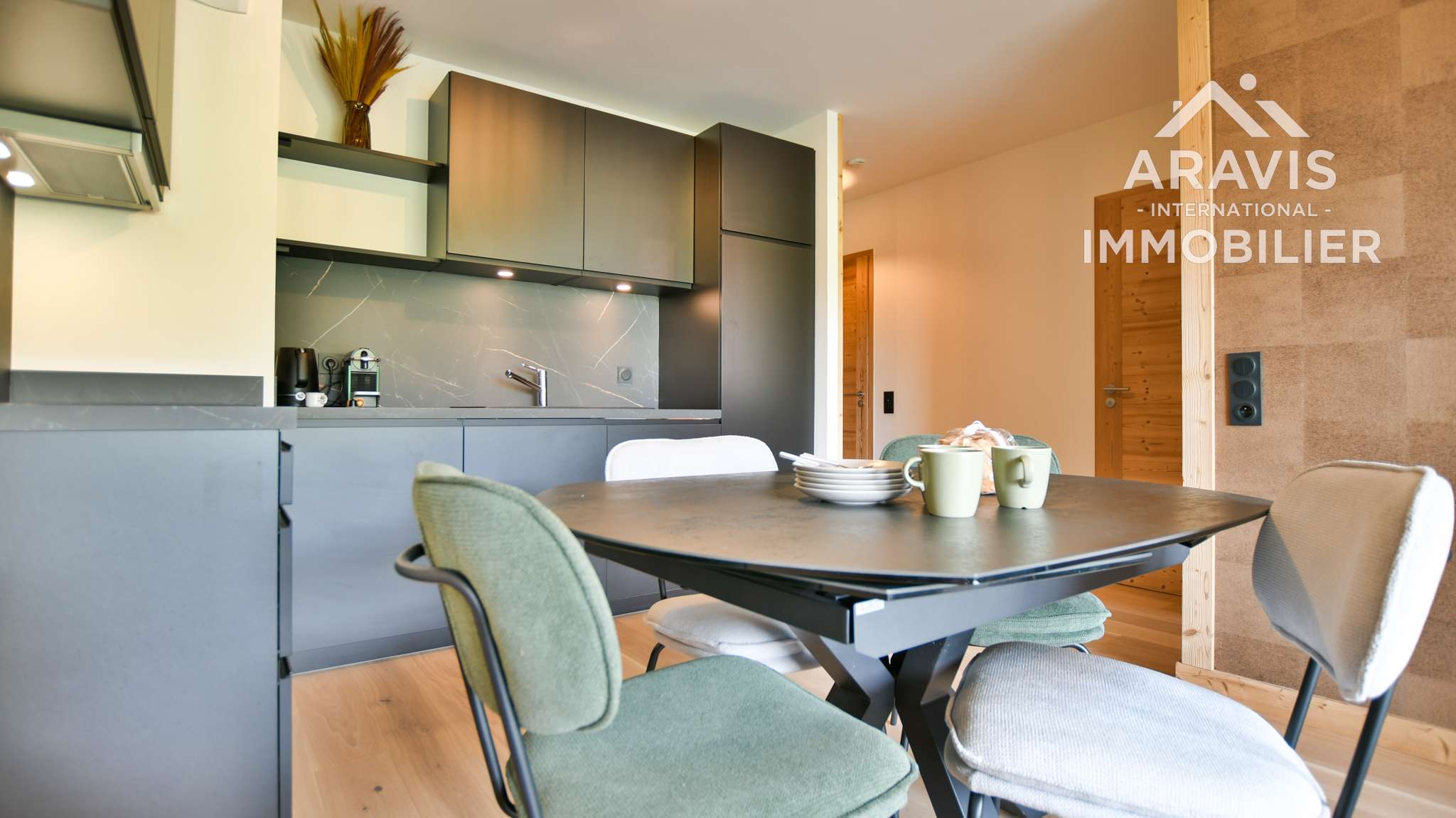 Appartement tout confort pour 2 adultes + 2 enfants, avec balcon panoramique, cuisine équipée, casier à ski et navette aux pieds de la résidence.